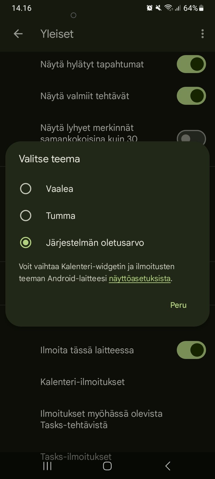 Google Kalenteria voi käyttää sekä valoisassa että tummassa tilassa.