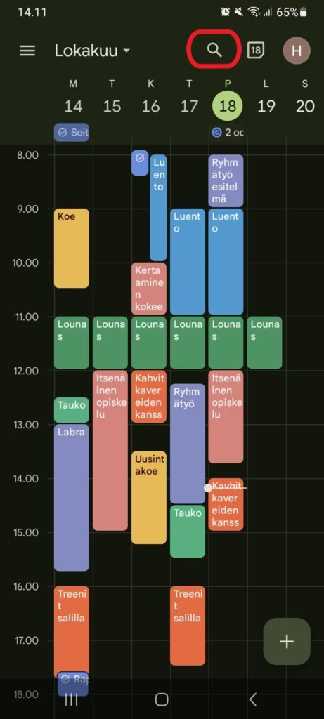 Voit hakea tapahtumia ja tehtäviä Google Kalenterista hakukentän avulla.