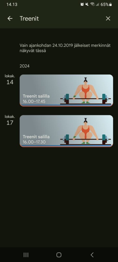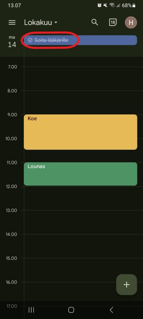 - Koko päivän tapahtumat ja tehtävät näkyvät kalenterin yläosassa.