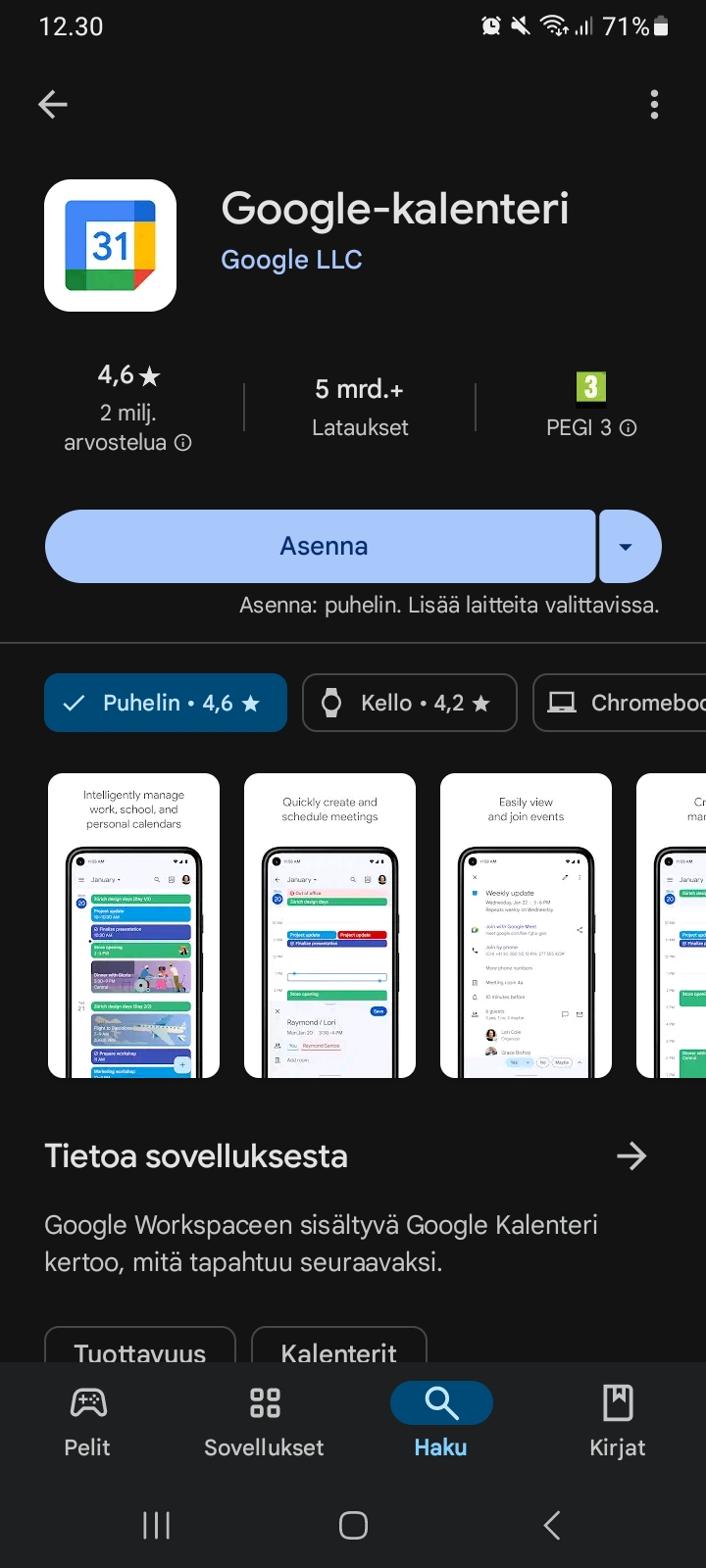 - Etsi ja lataa sovellus Google Play -kaupasta hakusanalla Google-kalenteri.
