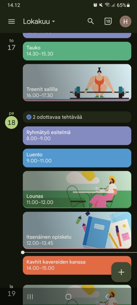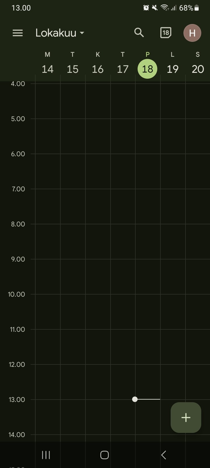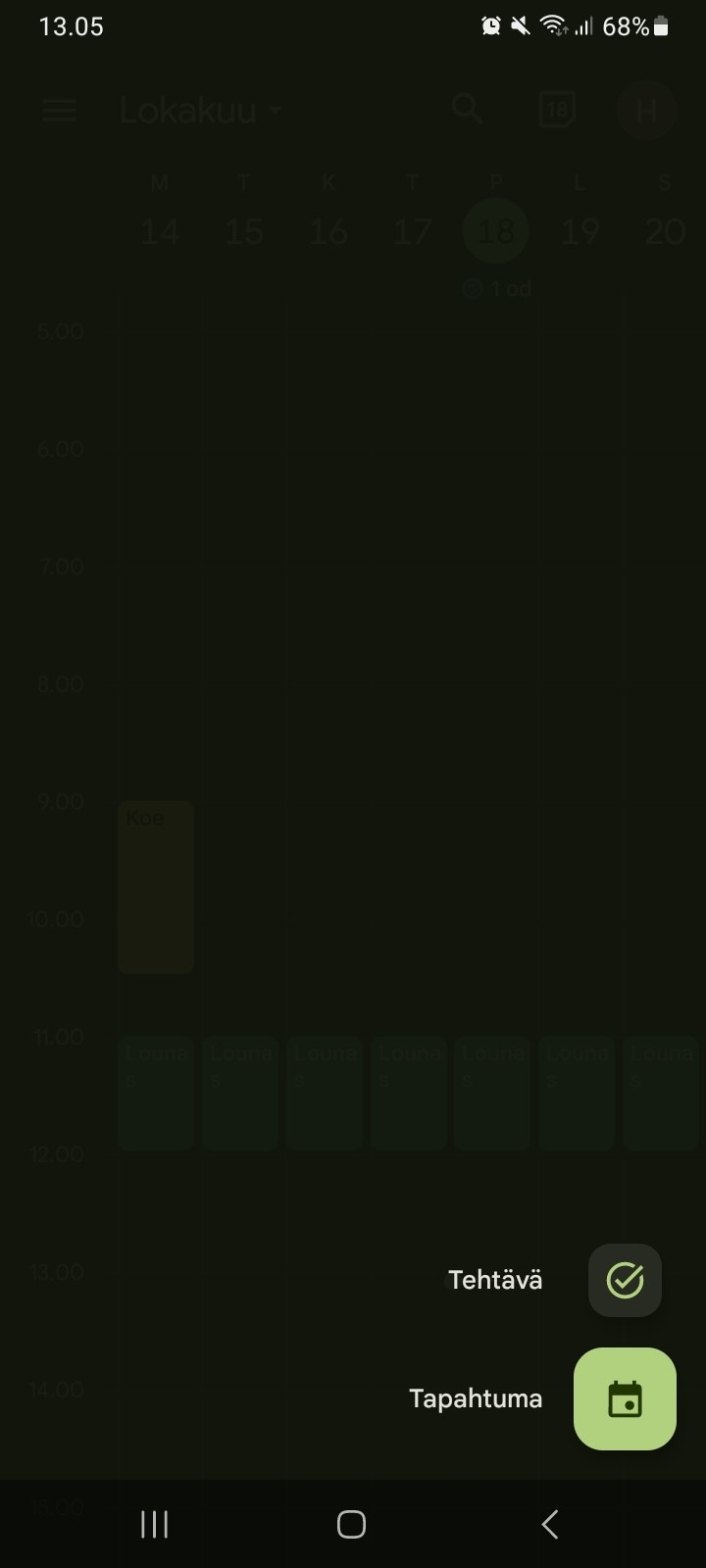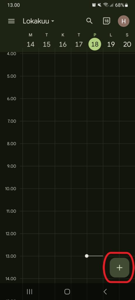 - Uuden tapahtuman tai tehtävän voit lisätä painamalla kyseistä päivää tai valitsemalla plussamerkin näytön oikeasta alakulmasta.