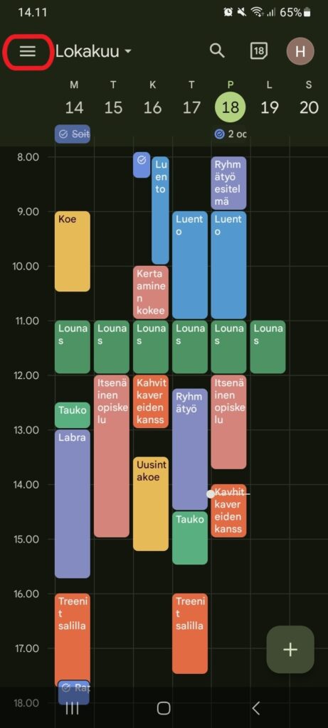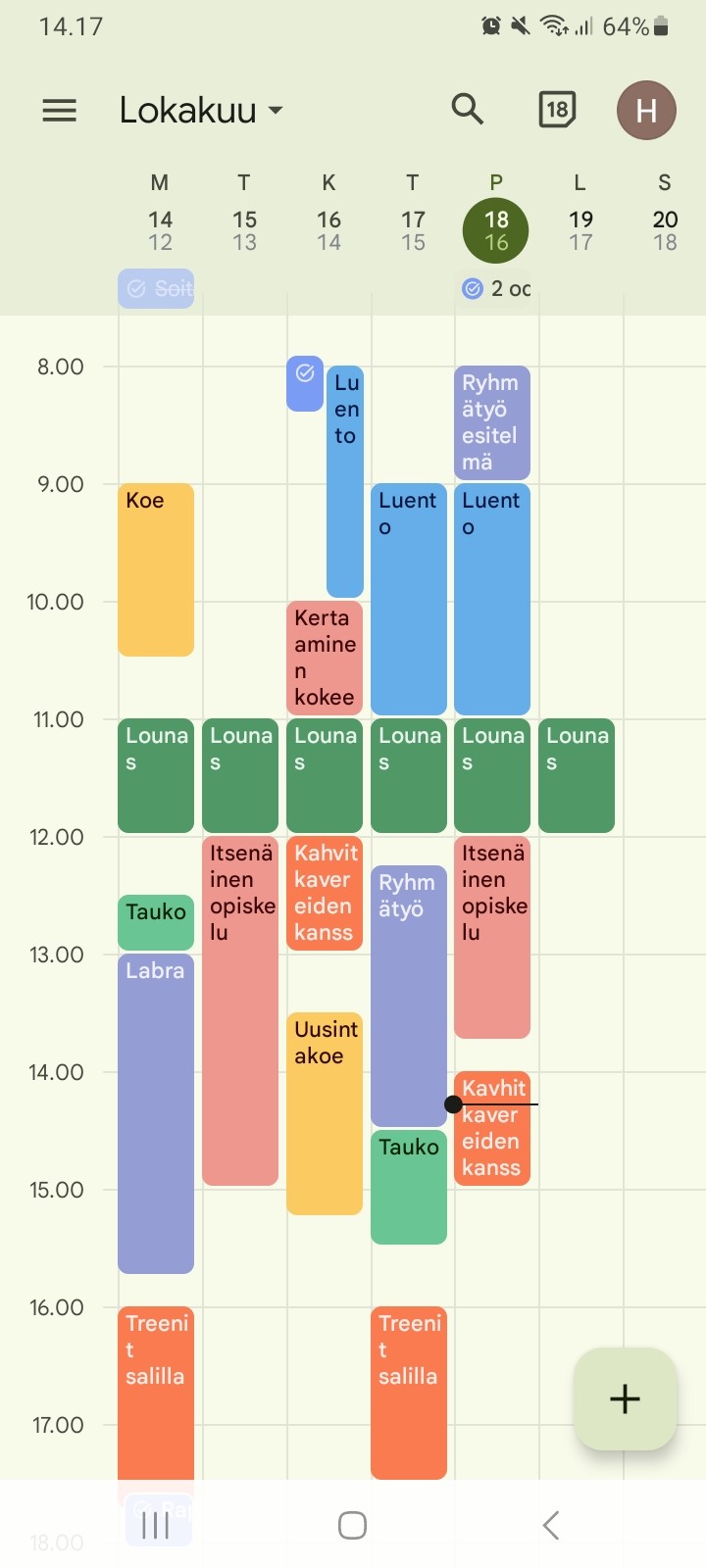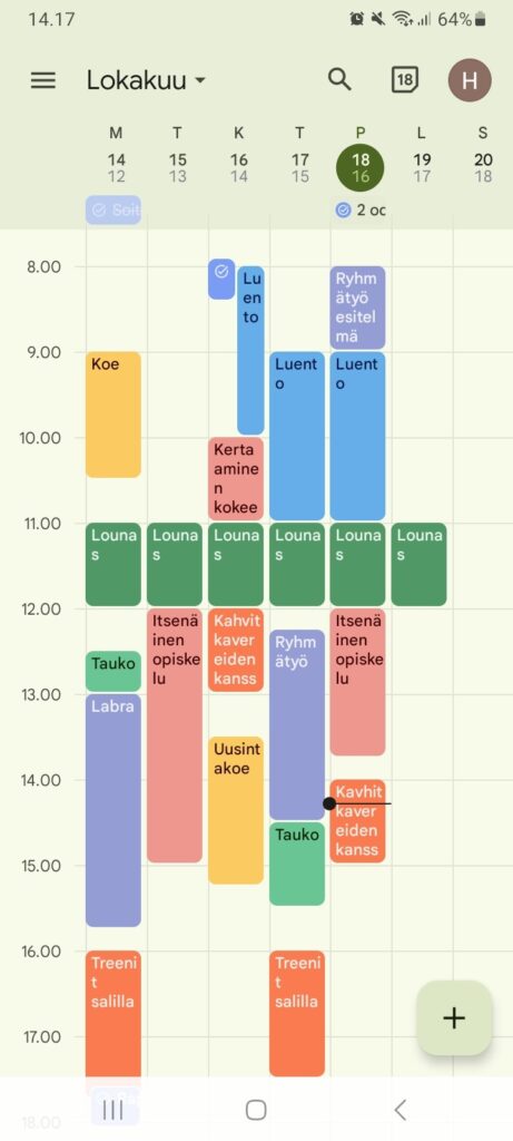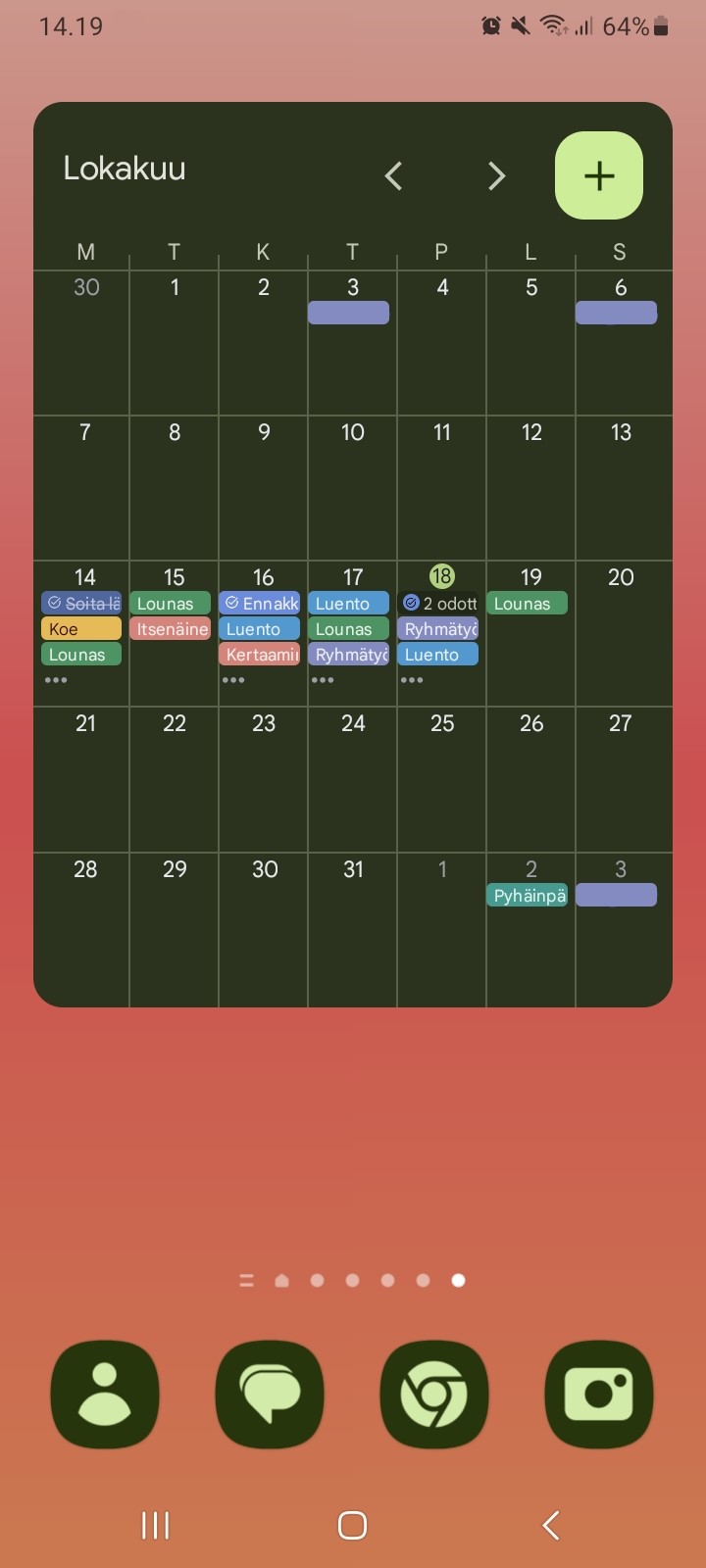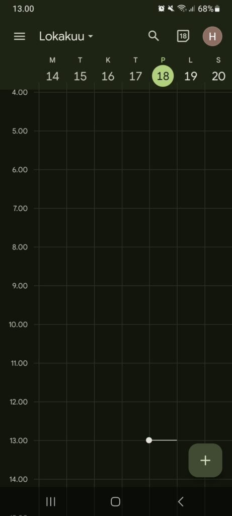 - Uuden tapahtuman tai tehtävän voit lisätä painamalla kyseistä päivää tai valitsemalla plussamerkin näytön oikeasta alakulmasta.