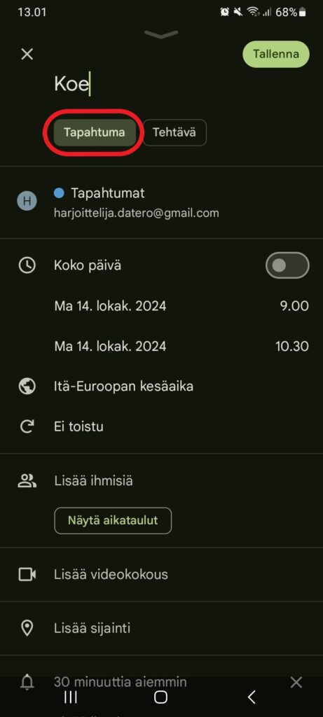 - Voit luoda joko tapahtuman tai tehtävän. Tapahtumilla on enemmän asetuksia kuin tehtävillä.