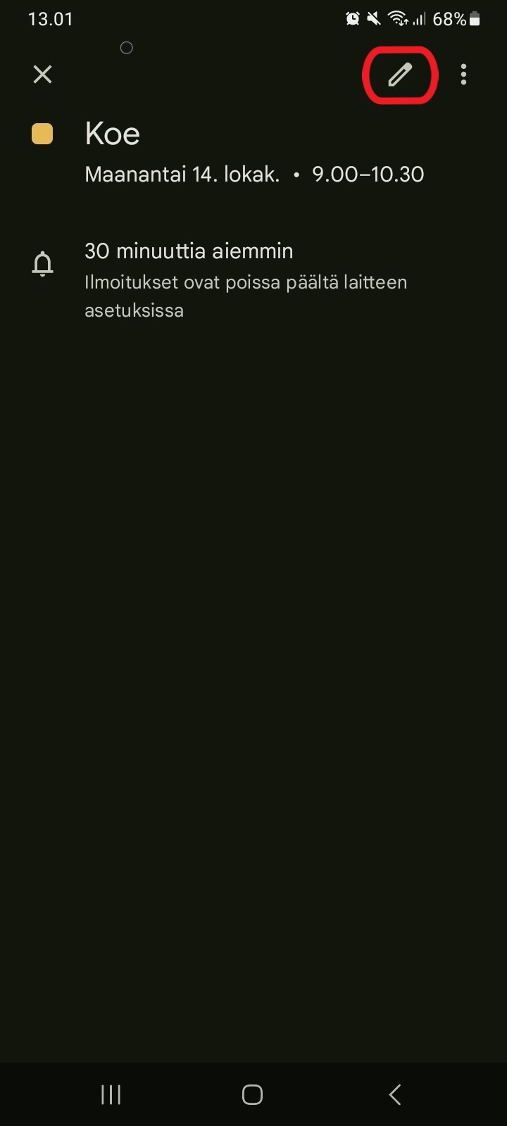 - Voit muokata tapahtumia ja tehtäviä valitsemalla ne kalenterista ja painamalla yläreunassa olevaa kynäkuvaketta.