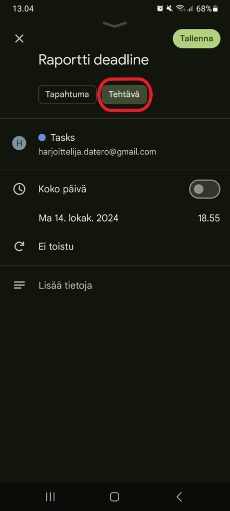 - Tallenna luomasi tehtävä tai tapahtuma painamalla tallennuspainiketta näytön yläreunasta.