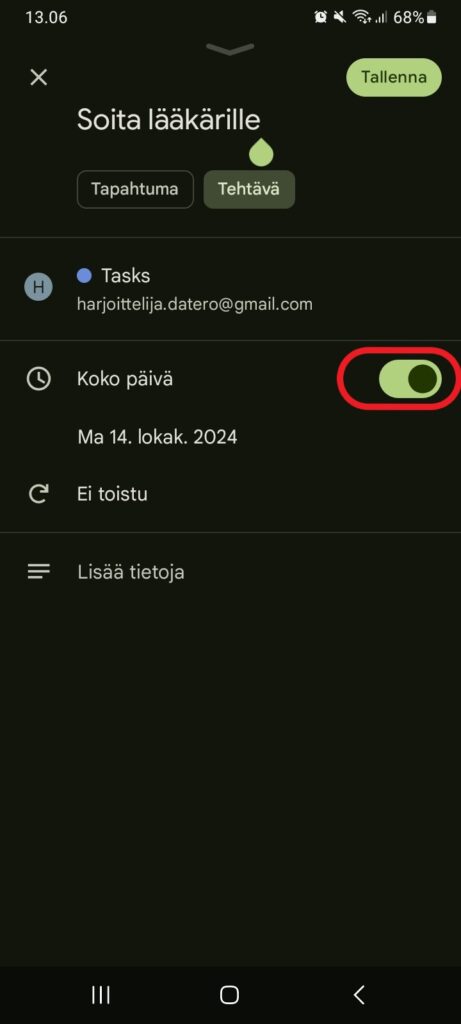 - Määrittää tehtävän ajan, koko päiväksi tai tietylle ajalle.